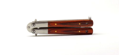Exkluzív megjelenésű pillangókés a stílus szerelmeseinek. Impozáns mérete erőt és tekintélyt sugároz. A markolat tömege miatt a súlypont végig jól kontrollálható. A kéz pengére csúszását dupla flipper gátolja.