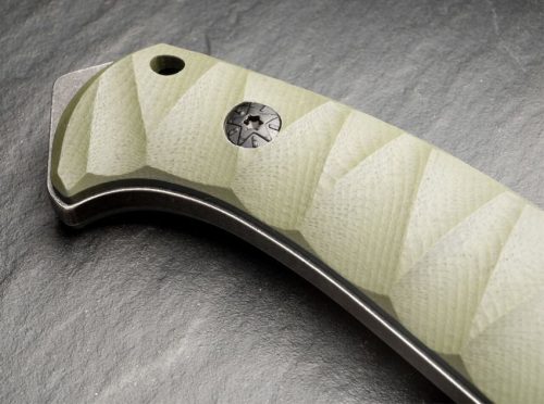 A kés markolata texturált, zöld színű G10 anyagból készül, ami kiváló fogást biztosít még nedves környezetben is. A markolat kialakítása ergonomikus, ami lehetővé teszi a kényelmes és biztonságos fogást.