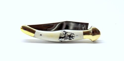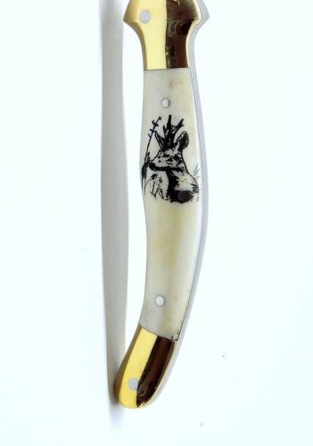 Fejesgörbe zsebkés , gravírozott agancs markolat, gravírozott őzbak motívummal