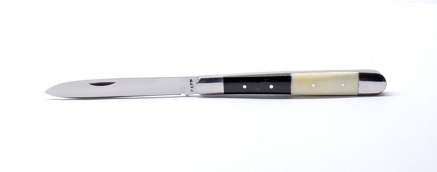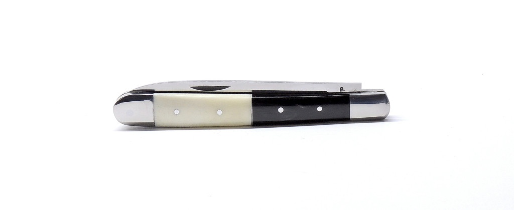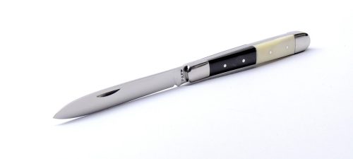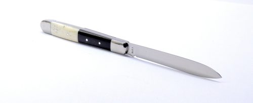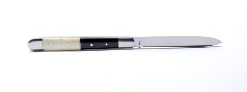 A markolat az igazi különlegessége ennek a darabnak: az első rész elegáns fekete bivalyszaruból készül, míg a hátsó rész természetes agancsból vagy szürke marha csontból. Ez a kombináció nemcsak esztétikailag egyedi, hanem fogásra is kellemes, meleg érzetet ad – minden darab egy kicsit más, így valóban egyedi bicskát kap a tulajdonosa.