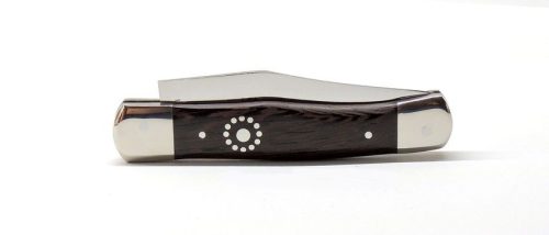 Grószi Maskara Extra zsebkés, bicska, wenge fa markolattal, amely mindkét oldalán napkorong díszítés található. A baknik és az alaplapok tömör rozsdametes acélból készültek.