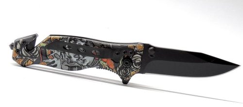 A 440A rozsdamentes acél penge kiváló élesítési tartósságot biztosít, míg a liner lock zárrendszer biztonságos használatot garantál. A csúszásmentes markolat acél alaplapokkal és futurisztikus koponya díszítéssel kifinomult megjelenést kölcsönöz. A praktikus hevedervágó és törő végek további funkcionalitást adnak. Könnyű és ergonomikus kialakításával ideális választás mindennapos használatra. Fedezze fel a stílust és funkcionalitást ebben az egyedülálló zsebkésben, ami nemcsak praktikus, hanem egyben stílusos kiegészítője is lehet mindennapi életének!