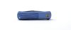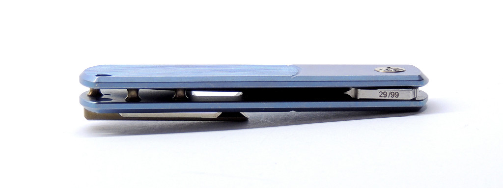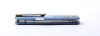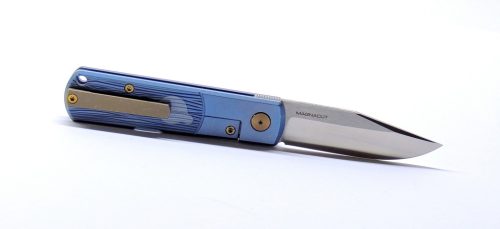 A penge CPM MagnaCut poracélból készült — ez jelenleg az egyik legjobb tulajdonságú EDC acél a piacon, nagy élállósággal, magas korrózióállósággal és meglepően jó szívóssággal. A markolat kék-anodizált titán, precízen mart felülettel, amely egyszerre elegáns és modern. A kés flipperrel nyitható, a mozgást golyóscsapágy teszi simává és hangtalanul finommá. A zárszerkezet megbízható frame-lock, edzett betéttel.