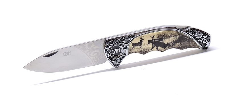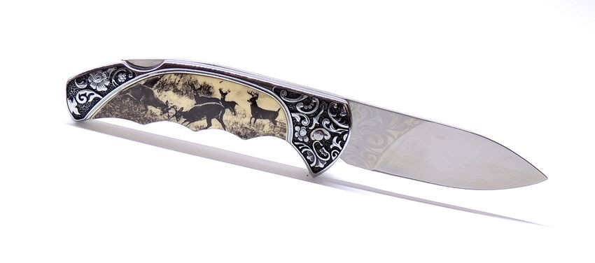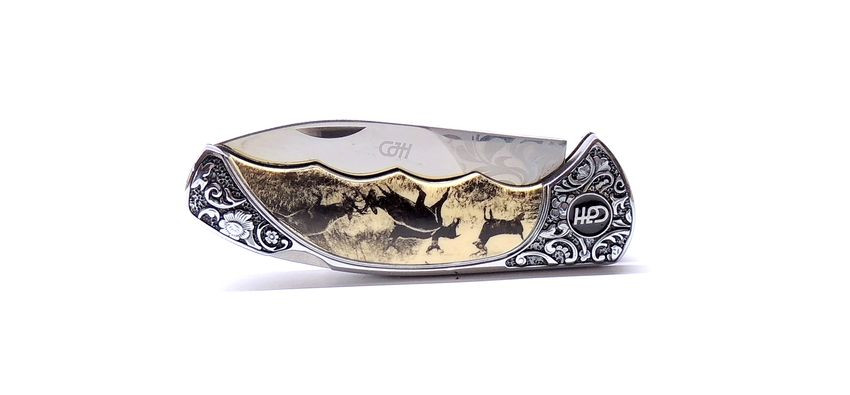 A markolatba épített szarvasos jelenet nem egyszerű díszítés. Inkább hangulat. Erdőszél, hajnali pára, csend. Az a fajta kép, amit az ember nem csak néz, hanem ismer. A fém keret és a részletgazdag motívum szépen keretezi a pengét, így csukott állapotban szinte ékszer jellegű darab.