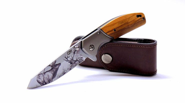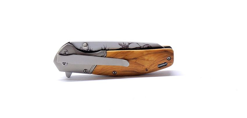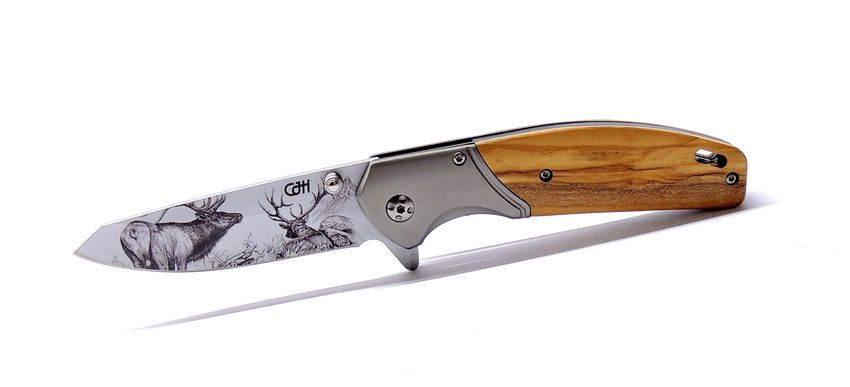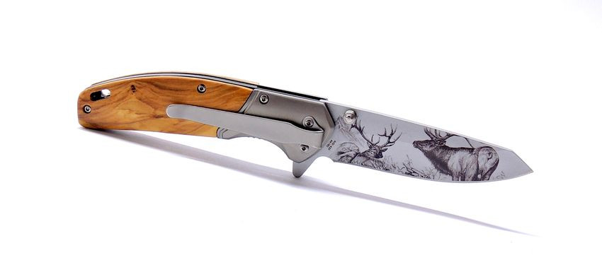 A Drop Point típusú penge sima éllel és üreges leélezéssel AISI 420 rozsdamentes acélból készült, titán védőbevonattal, amelyet szarvas grafika díszít. A golyóscsapágyak támogatják a penge nyitási mechanizmusának sima működését, amelyet hüvelykujjtárcsával vagy flipperrel lehet nyitni. Az egész szerkezetet egy masszív Linerlock zárja.